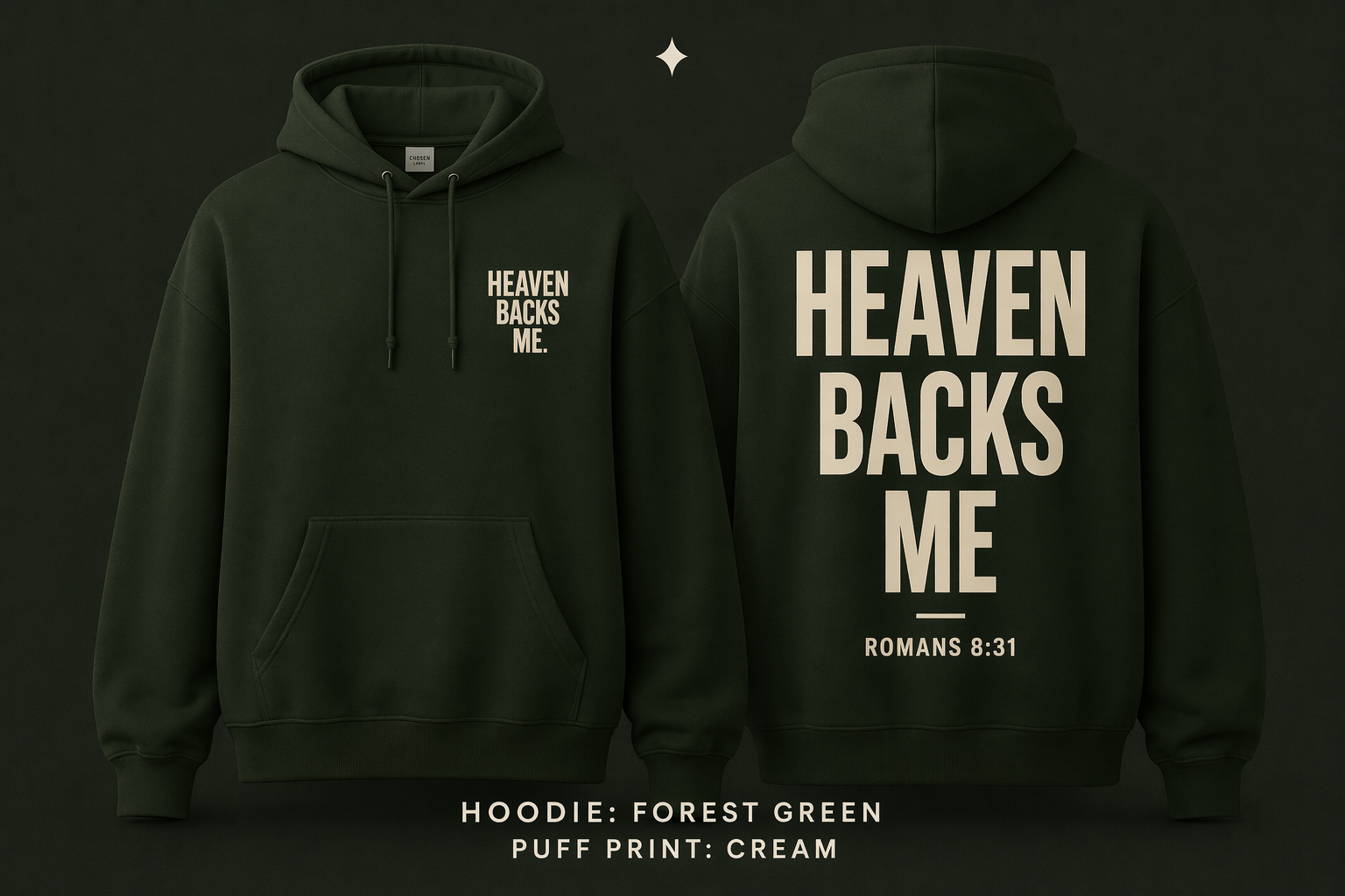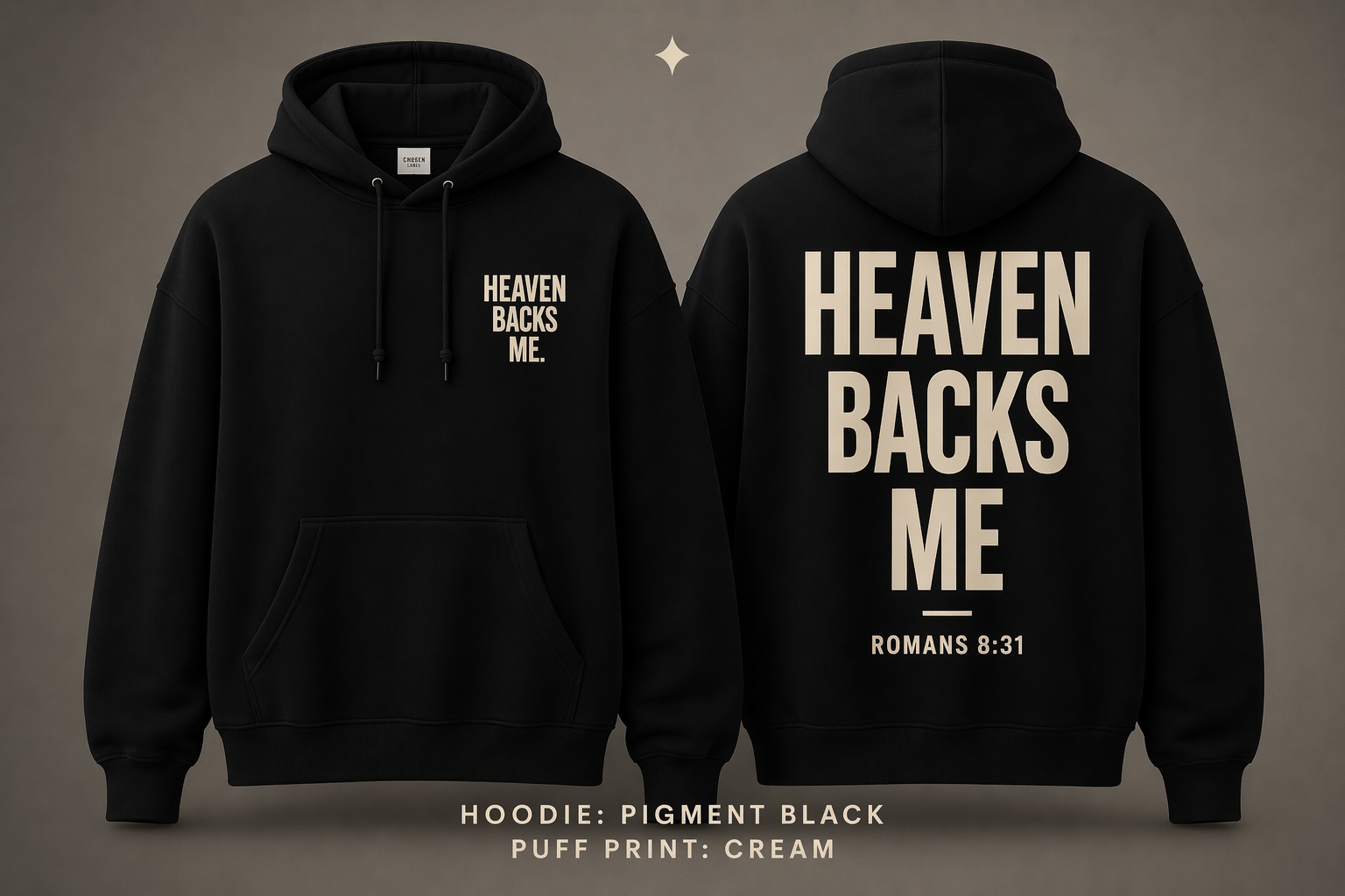 Inspired by Romans 8:31, the “Heaven Backs Me” hoodie is designed for those walking in faith, confidence, and purpose. Whether you're stepping into a new season or standing firm where you are, this piece speaks before you say a word.